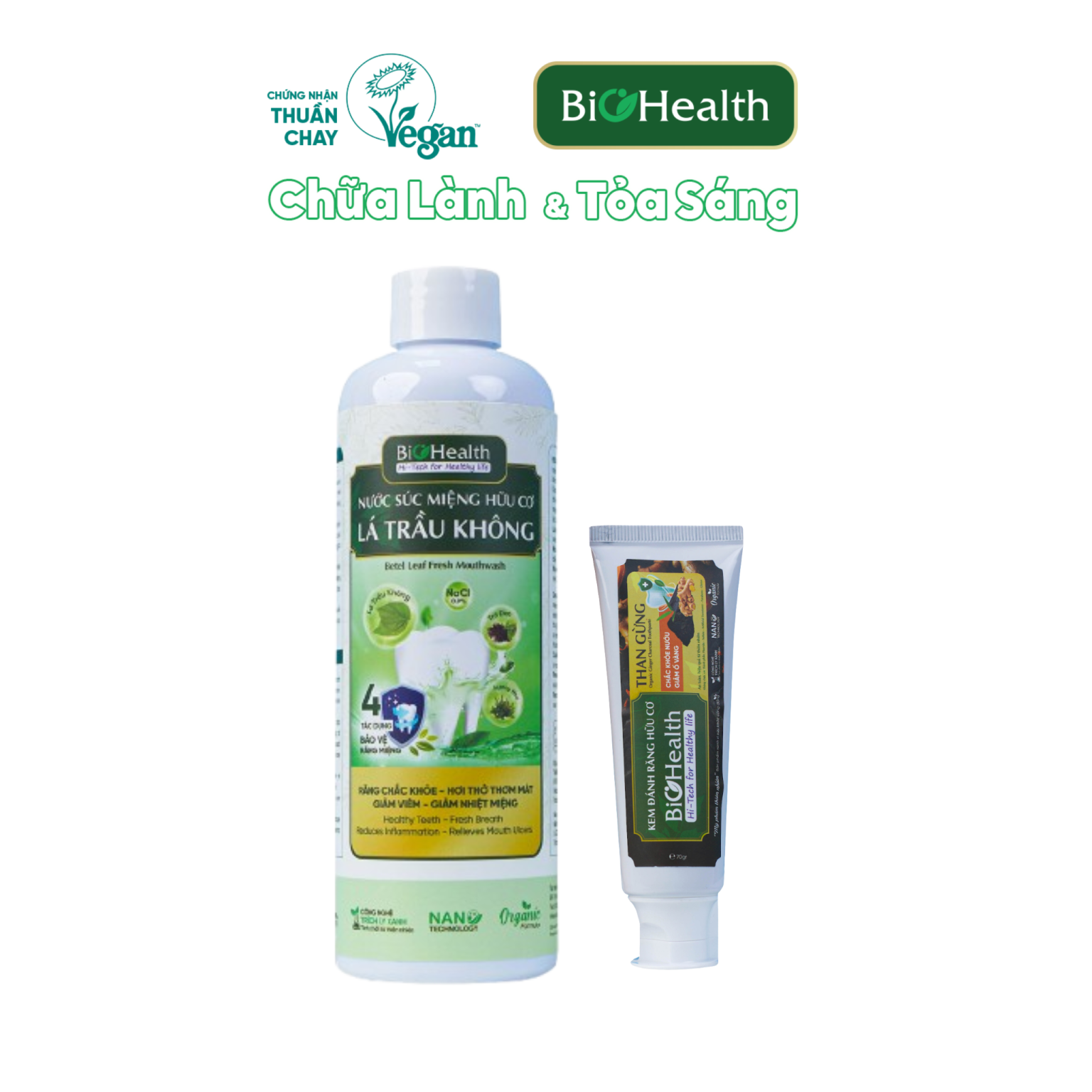 Combo Chăm sóc răng miệng BioHealth được thiết kế như một giải pháp hai bước hằng ngày: Giúp làm sạch khoang miệng, mang lại cảm giác thơm mát và dễ chịu sau khi sử dụng. Sự kết hợp giữa Kem đánh răng Thiên nhiên Thuần chay Than Gừng và Nước súc miệng Lá Trầu Không mang đến trải nghiệm chăm sóc răng miệng thuần chay, dịu nhẹ và lành tính, phù hợp cho cả gia đình và người có răng nướu nhạy cảm. Sản phẩm đạt chứng nhận Thuần Chay – Vegan UK (Anh Quóc).